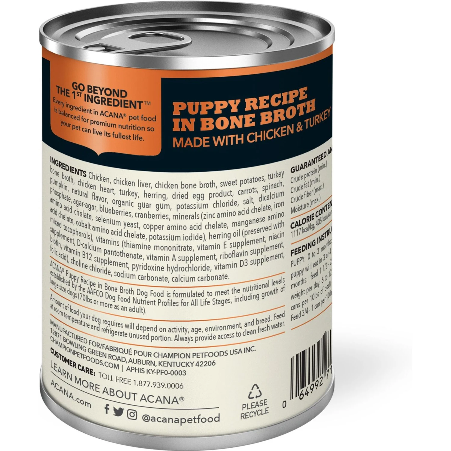 ACANA Puppy Recipe Grain-Free Dry Puppy Food, 4.5-lb bag—ACANA Puppy Recipe Grain-Free Dry Puppy Food is specially crafted with protein and fat from quality animal protein to support your growing puppy’s development. It contains 60% quality animal ingredients, including free-run chicken and turkey, and cage-free eggs, plus 40% fruits, vegetables and botanicals like whole pumpkin. There are also vitamins, minerals, natural preservatives and probiotics added, and zero artificial colors, flavors or preservatives. ACANA always uses premium ingredients from a curated group of trusted farmers, ranchers and fishers, and every batch of food is made in their state-of-the-art Kentucky kitchen.