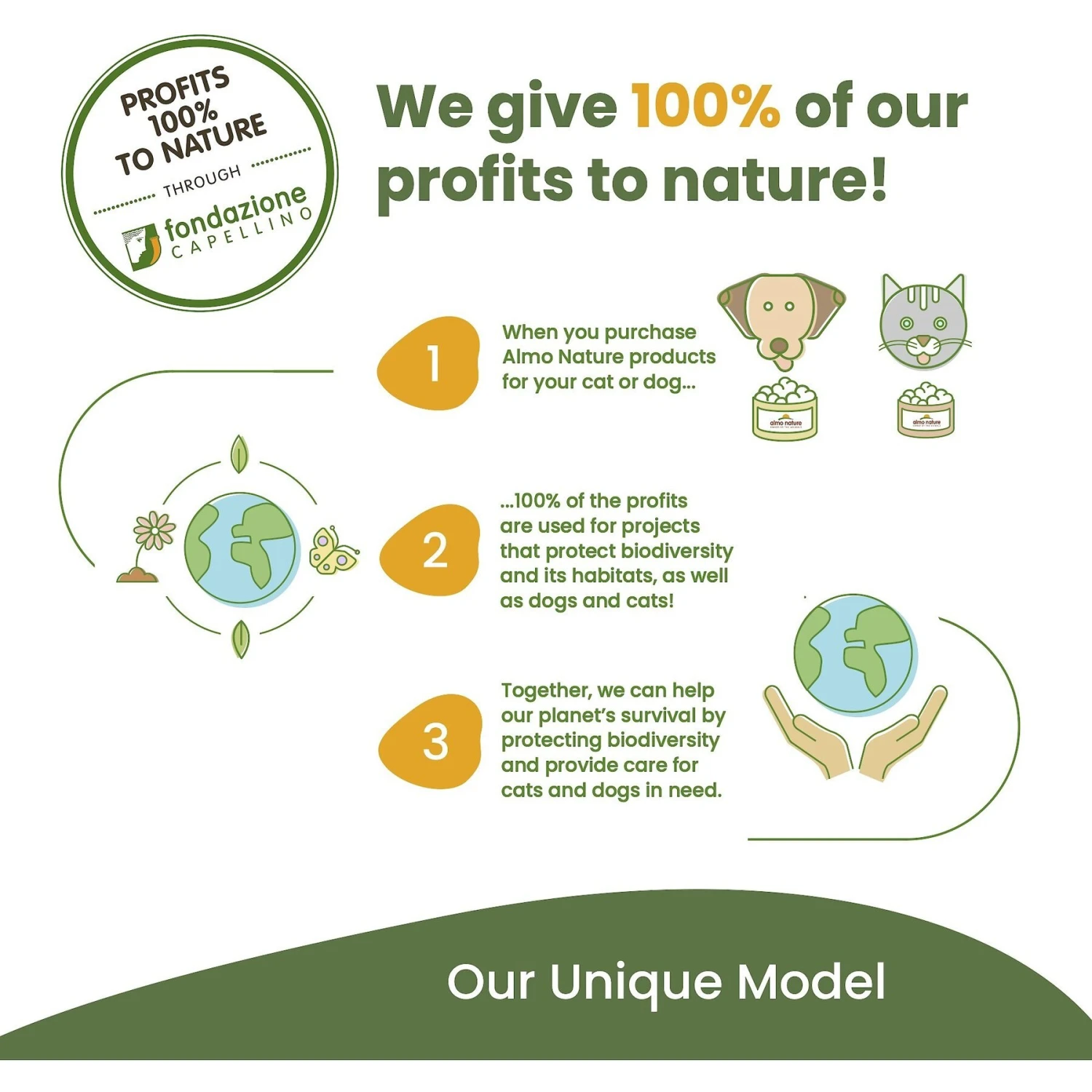 - 100% of the revenues from Almo Nature product sales (after expenses and taxes) go toward Almo Nature’s mission to protect biodiversity and fight against climate change.