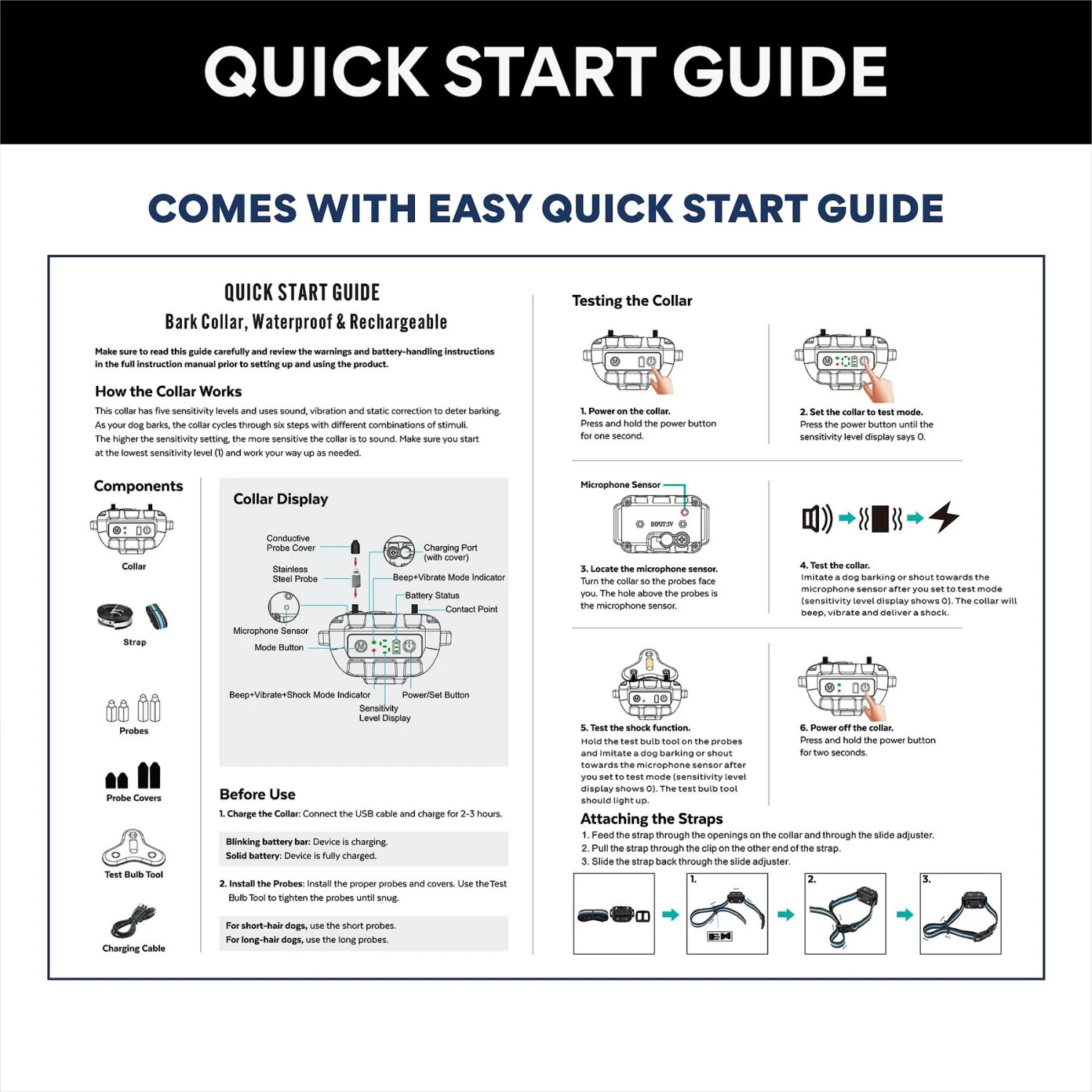 Bark Collar, Nylon Collar Strap, TPU Collar Strap, (2) Pairs Metal Prongs, (2) Pairs Rubber Prong Covers, Test Bulb, USB Cable, User Manual, Charging Warning Card, Sensitivity Instruction Manual.