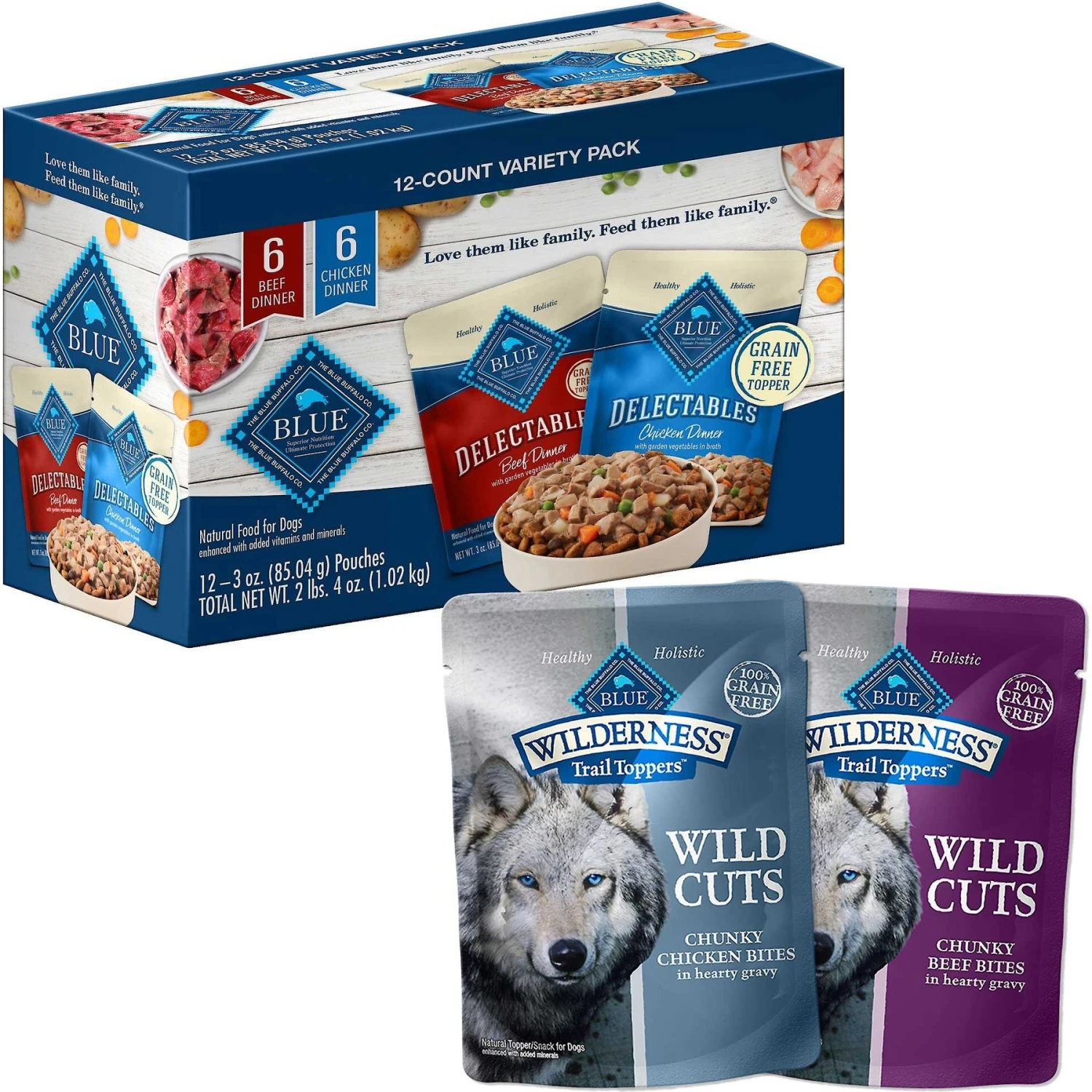 Blue Buffalo Delectables Chicken & Beef Dinner Variety Pack Grain-Free Wet Dog Food Topper, 3-oz Pouches, Case Of 12 & Blue Buffalo Wilderness Trail Toppers Wild Cuts Variety Pack Chunky Chicken & Beef Bites In Gravy Grain-Free Dog Food Topper, 3-oz, Pouch Of 12