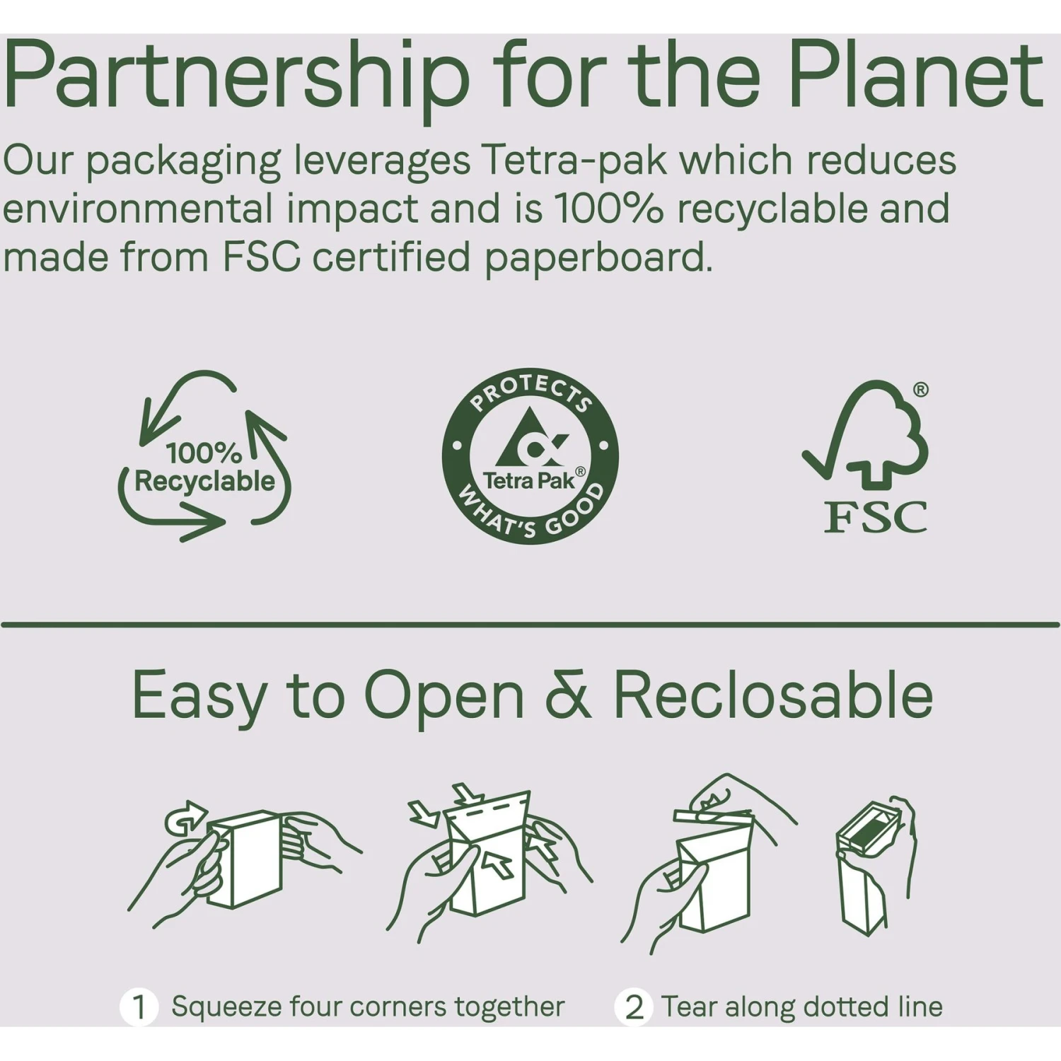 - Earth-friendly cartons are easy to open, resealable and 100% recyclable.