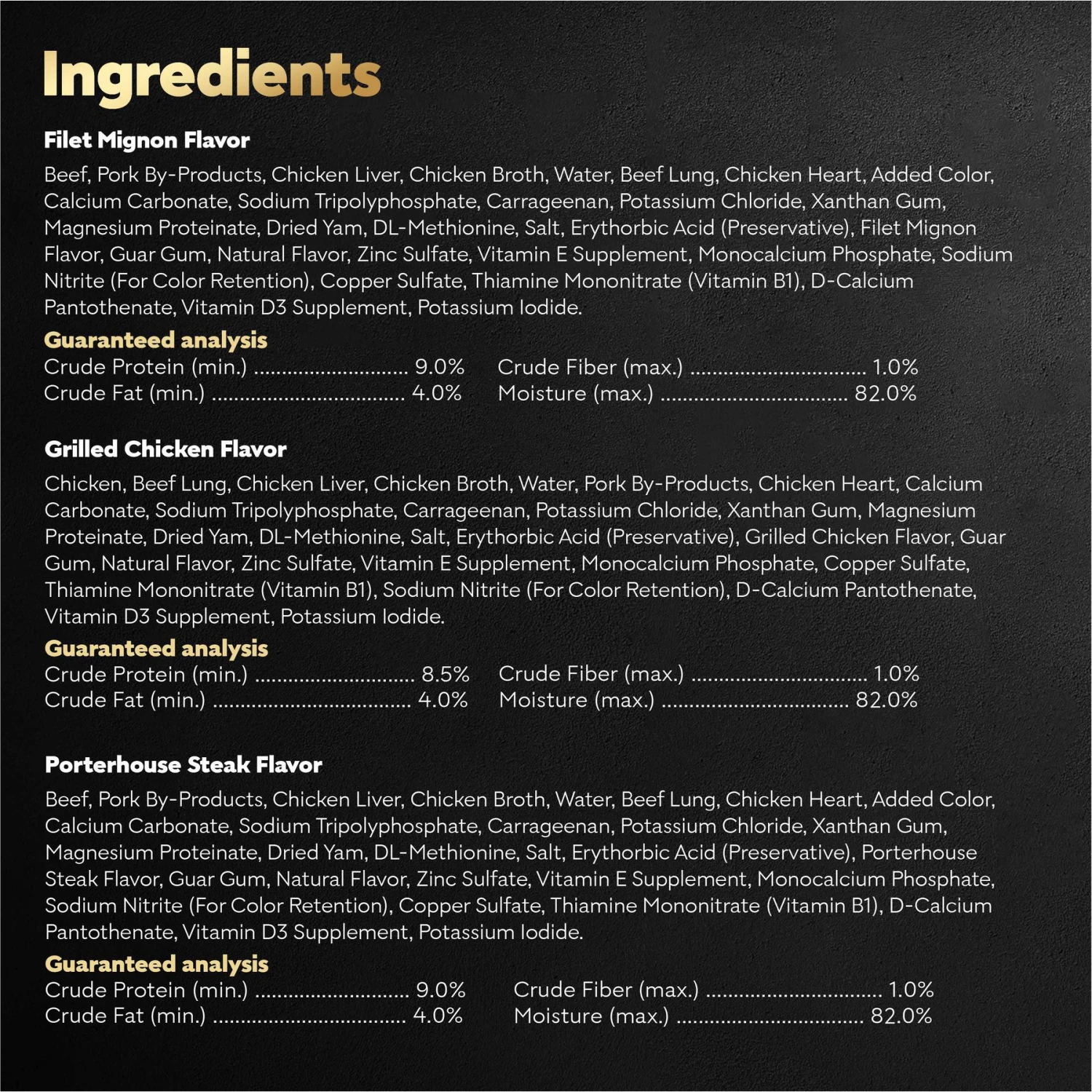 | Flavor | Turkey, Chicken & Veal, Variety Pack: Steak Lovers 2, Variety Pack: Steak, Filet Mignon, Variety Pack: Poultry Lovers, Top Sirloin, Chicken & Liver, Variety Pack: Beef, Steak & Chicken, Variety Pack: Breakfast & Dinner, Porterhouse Steak, Variety Pack: Poultry, Variety Pack: Steak & Chicken Lovers, Variety Pack: Classic, Variety Pack: Breakfast, Variety Pack: Steak & Chicken, Oven Roasted Chicken, Lamb, Grilled Steak and Eggs, Grilled Chicken, Smoked Bacon & Egg, Variety Pack Steak Lovers 1, Variety Pack: Class & Home Delights, Beef |