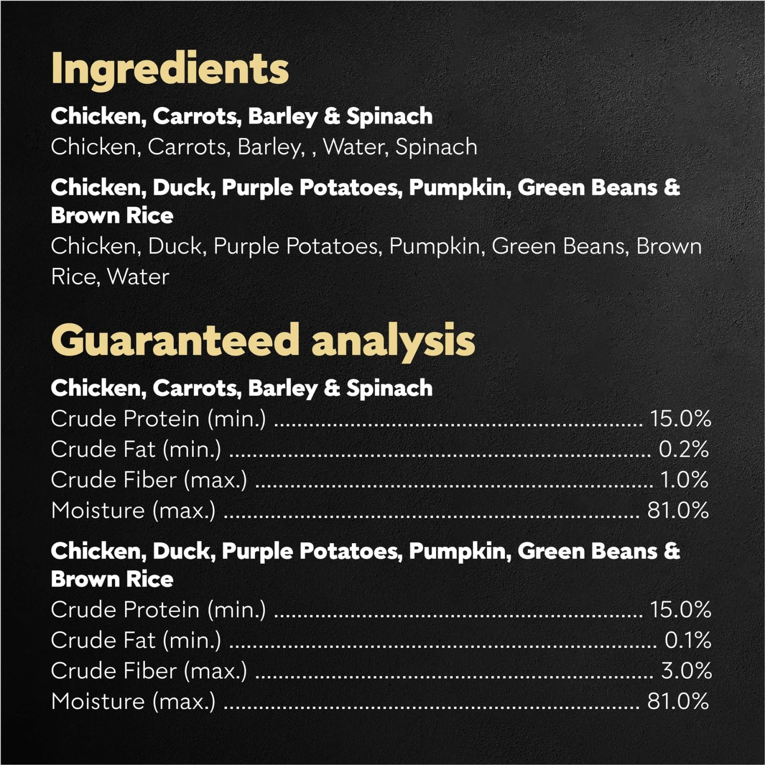 | Flavor | Variety Pack 2, Chicken & Sweet Potato, Chicken, Carrots, Barley & Spinach, Chicken, Carrots & Green Beans, Beef, Chicken, Peas & Carrots, Variety Pack 3, Chicken, Carrots, Potatoes & Peas, Chicken, Chicken & Duck, Variety Pack 5, Variety Pack 1, Variety Pack 4 |
