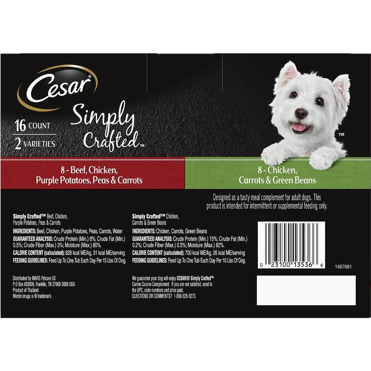 Cesar Simply Crafted Variety Pack Chicken, Carrots & Green Beans & Beef, Chicken, Purple Potatoes, Peas & Carrots Wet Dog Food Topper, 1.3-oz Can, 16 Count