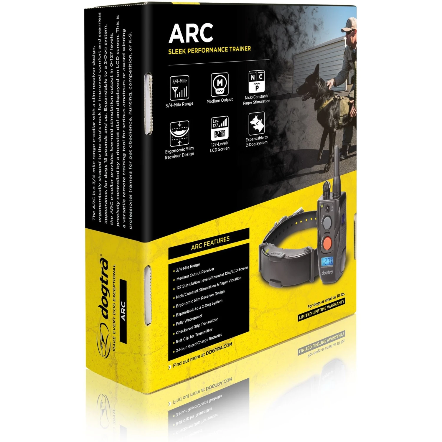 An ideal tool for the amateur dog trainer or professionals, the Dogtra Company ARC Dog Training Collar System is suitable for a variety of uses, including obedience, hunting and competition work. This 3/4-mile range e-collar features a slim receiver design, shaped to your dog’s neck for a comfortable and seamless look and feel. It’s suitable for dogs 15 pounds and up and expandable to a two-dog system. This versatile e-collar also offers low-to-mid stimulation output with 127 levels to choose from, controlled by a rheostat dial and displayed on an LCD screen.