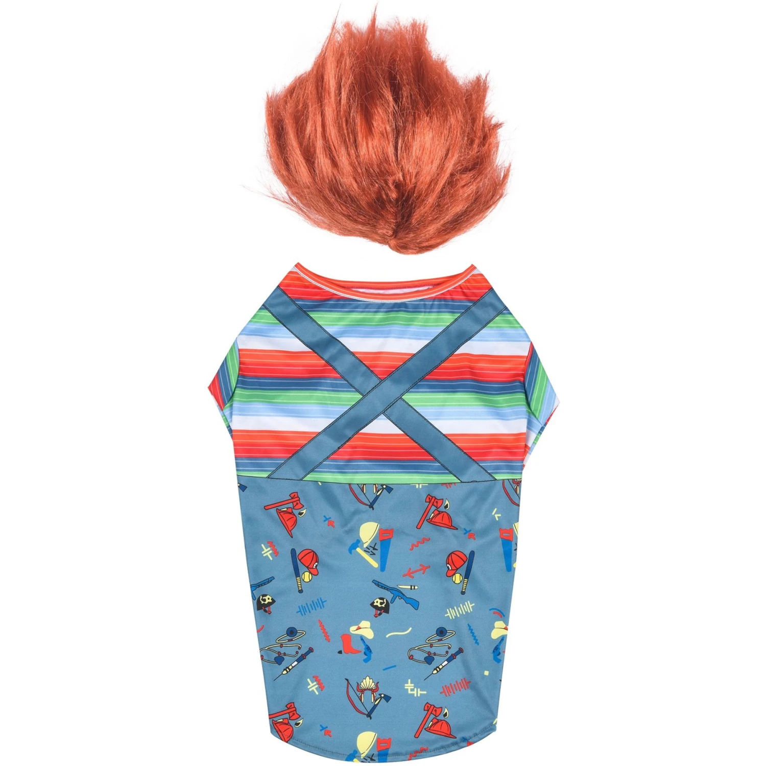 - Features Chucky’s iconic outfit and matching red-haired wig.