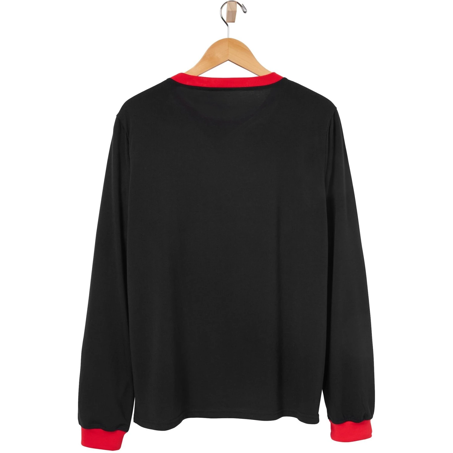 - Cozy, long sleeve shirt with a red-and-black plaid moose silhouette and red accents at the cuffs and collar.