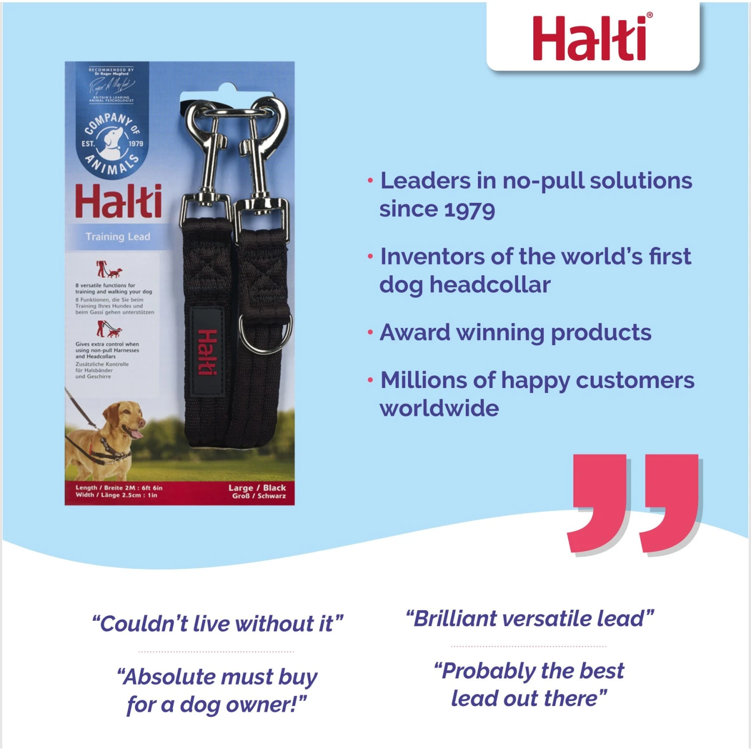 - The Halti Training Leash is a multi-functional, double-ended leash that can be used in seven different ways.