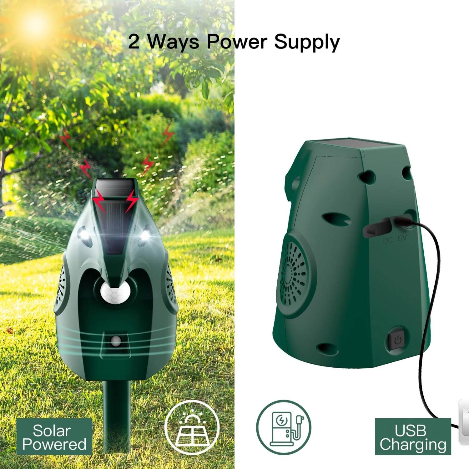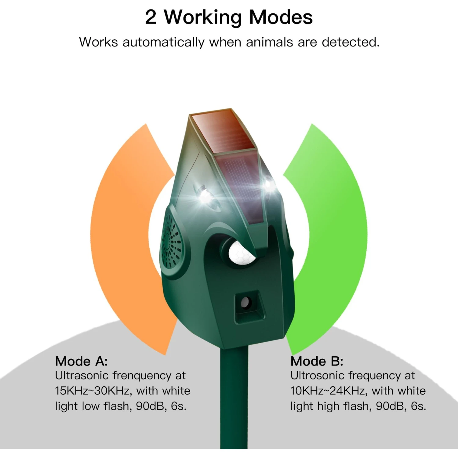 - This device is safe and friendly, emitting a 15kHz-30kHz & 10kHz-24kHz ultrasonic wave and flashing lights to drive away animals without releasing any chemical substances.