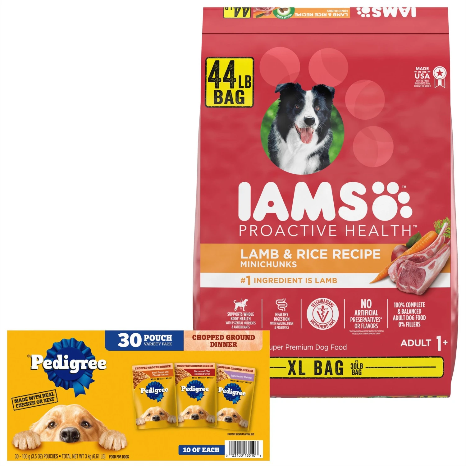 Iams Proactive Health Minichunks Small Kibble With Lamb & Rice Adult Dry Dog Food & Pedigree Chopped Ground Dinner Variety Pack Adult Wet Dog Food
