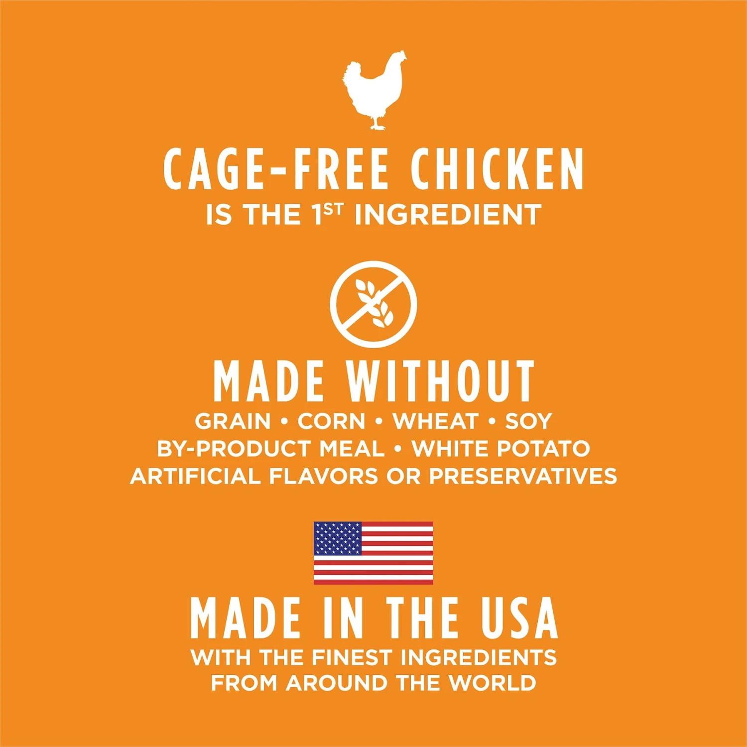 - Made without grains, corn, wheat, soy, white potato, and artificial flavors or preservatives.