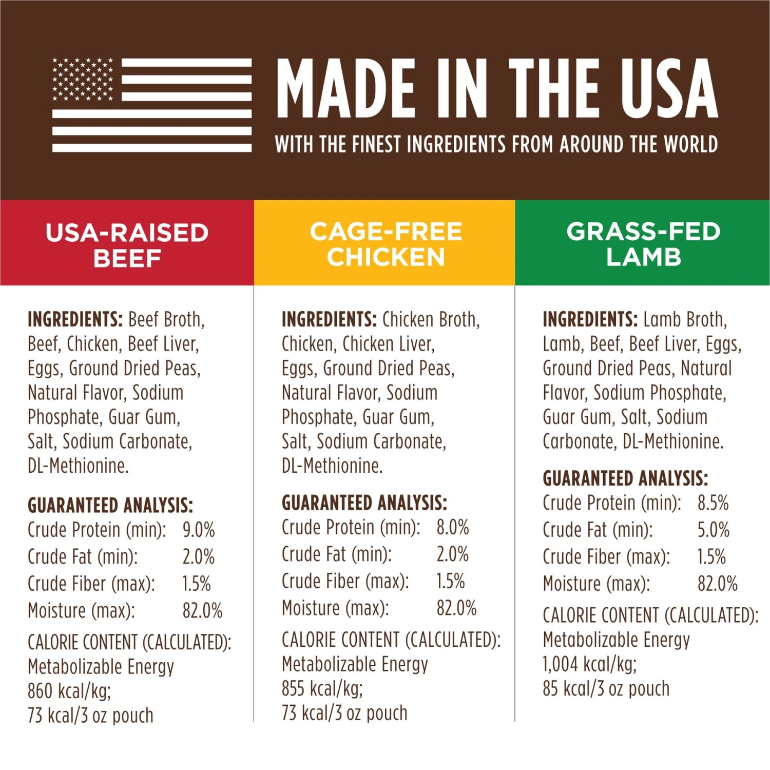 - Variety pack includes recipes made with either real USA-raised beef, cage-free chicken or grass-fed lamb in a savory, mouthwatering gravy.