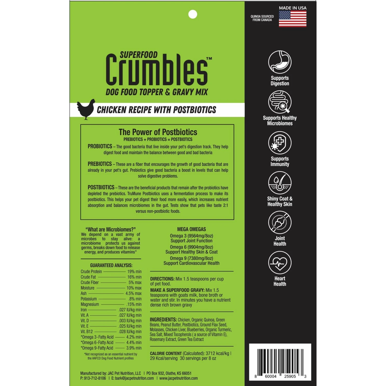 - Dehydrated for optimal nutrient preservation, this food topper includes superfoods like turmeric, blueberries, quinoa, flaxseed and green beans to support joint, skin and coat and heart health.