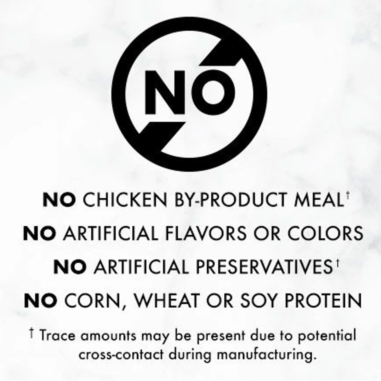- Formulated without grains, chicken by-product meal, corn, wheat, soy, or artificial colors, flavors, or preservatives, though trace amounts may be present due to cross-contact during manufacturing.