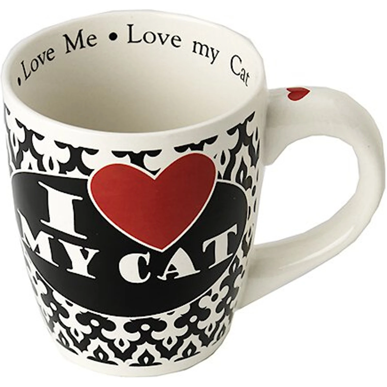- Mug features the saying “I (Heart) My Cat” with lettering along the inside rim.
