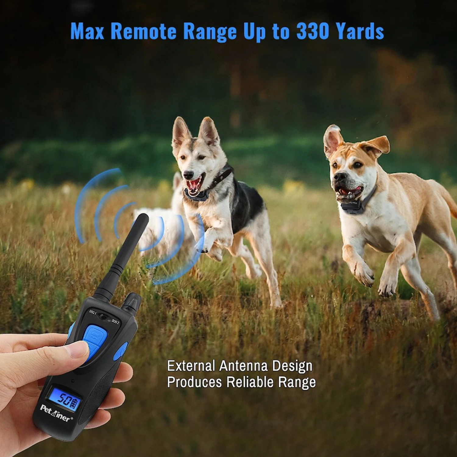 - The remote can be used from 330 yards away and you can control 2 collar receivers simultaneously.