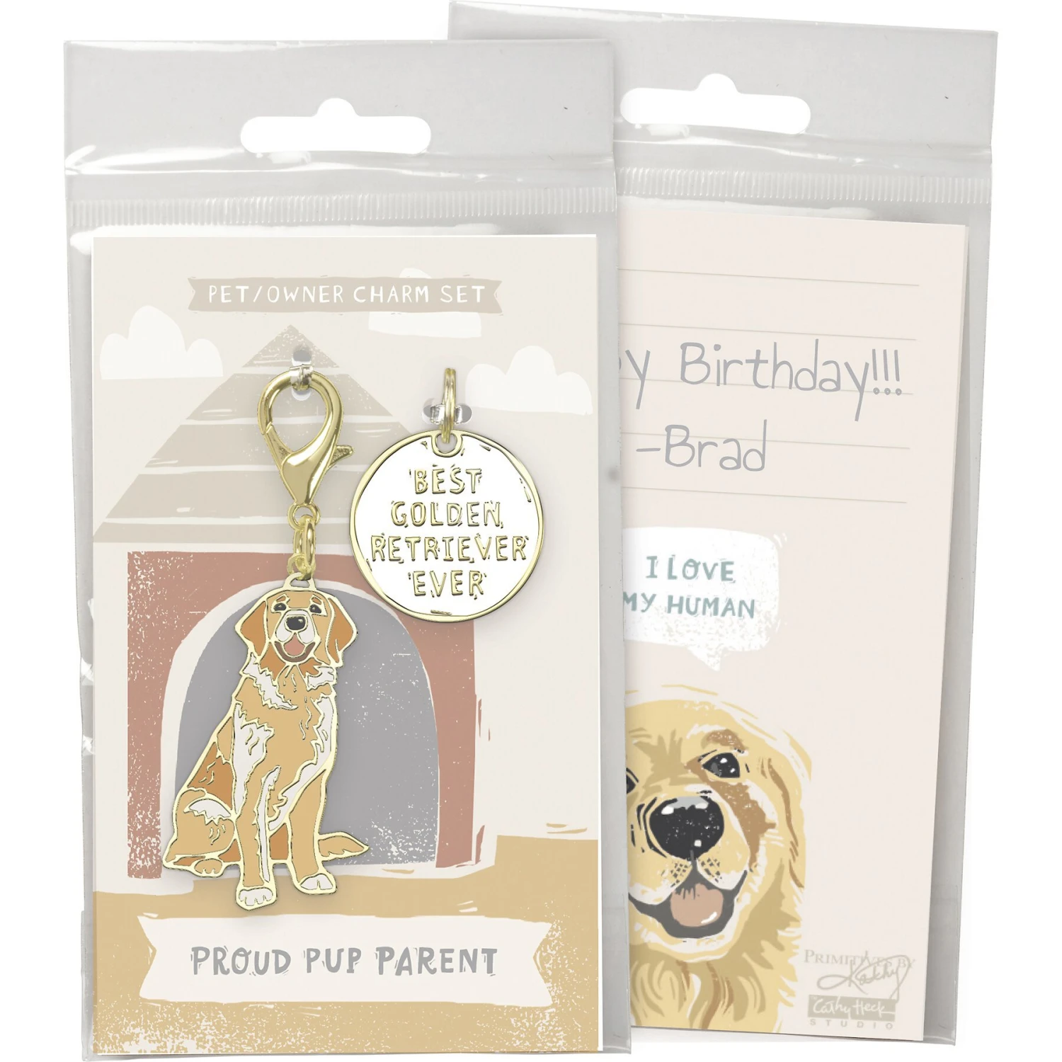 - Your charm features a Golden Retriever dog-shaped design and his charm reads “Best Golden Retriever Ever.”