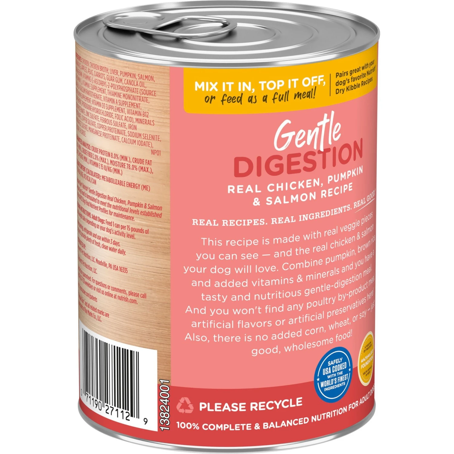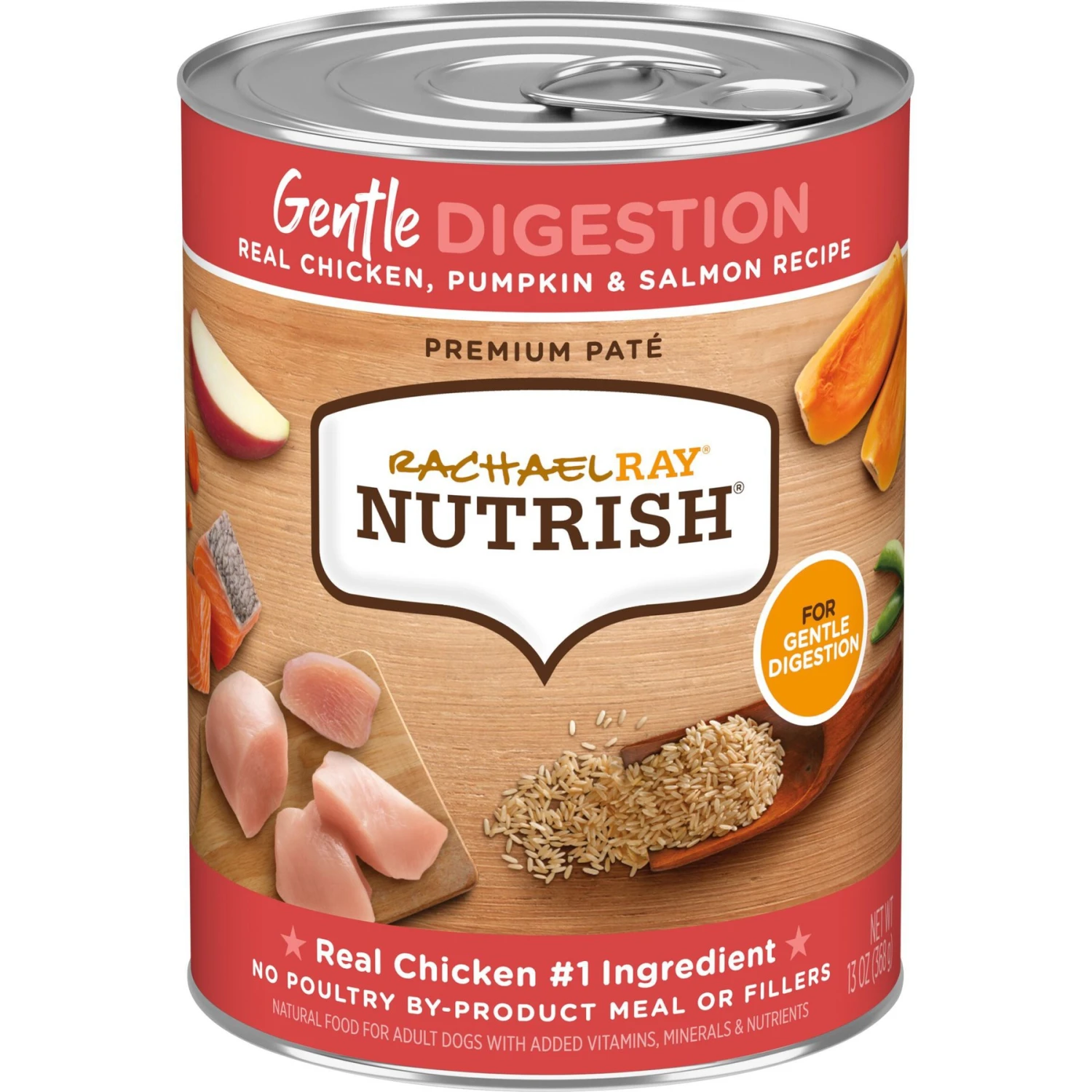 Rachael Ray Nutrish Gentle Digestion Real Chicken, Pumpkin & Salmon Canned Dog Food, 13-oz, case of 12—Delicious shouldn’t mean hard to digest. Turn your pup’s mealtime into a gourmet experience that is gentle on his tummy with Rachael Ray Nutrish Gentle Digestion Real Chicken, Pumpkin & Salmon Wet Dog Food. Made with real chicken and salmon, this premium paté dog food is designed for adult dogs and helps promote healthy digestion. It’s packed with real vegetables pieces and has pumpkin, brown rice and added vitamins and minerals to give your best bud a tasty, complete and balanced meal. Put it on top of your fur-iend’s favorite dry kibble or serve it on its own as a full meal. The gourmet recipe is all wholesome goodness—no added corn, wheat, soy, fillers or poultry by-products.