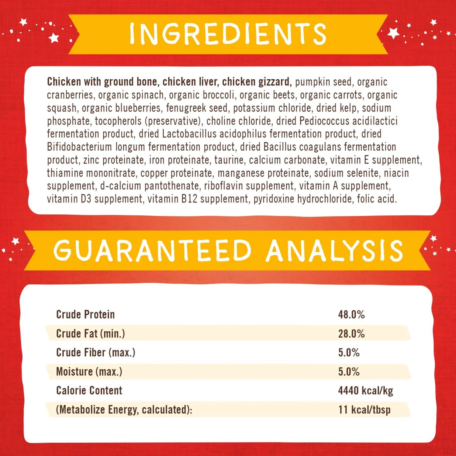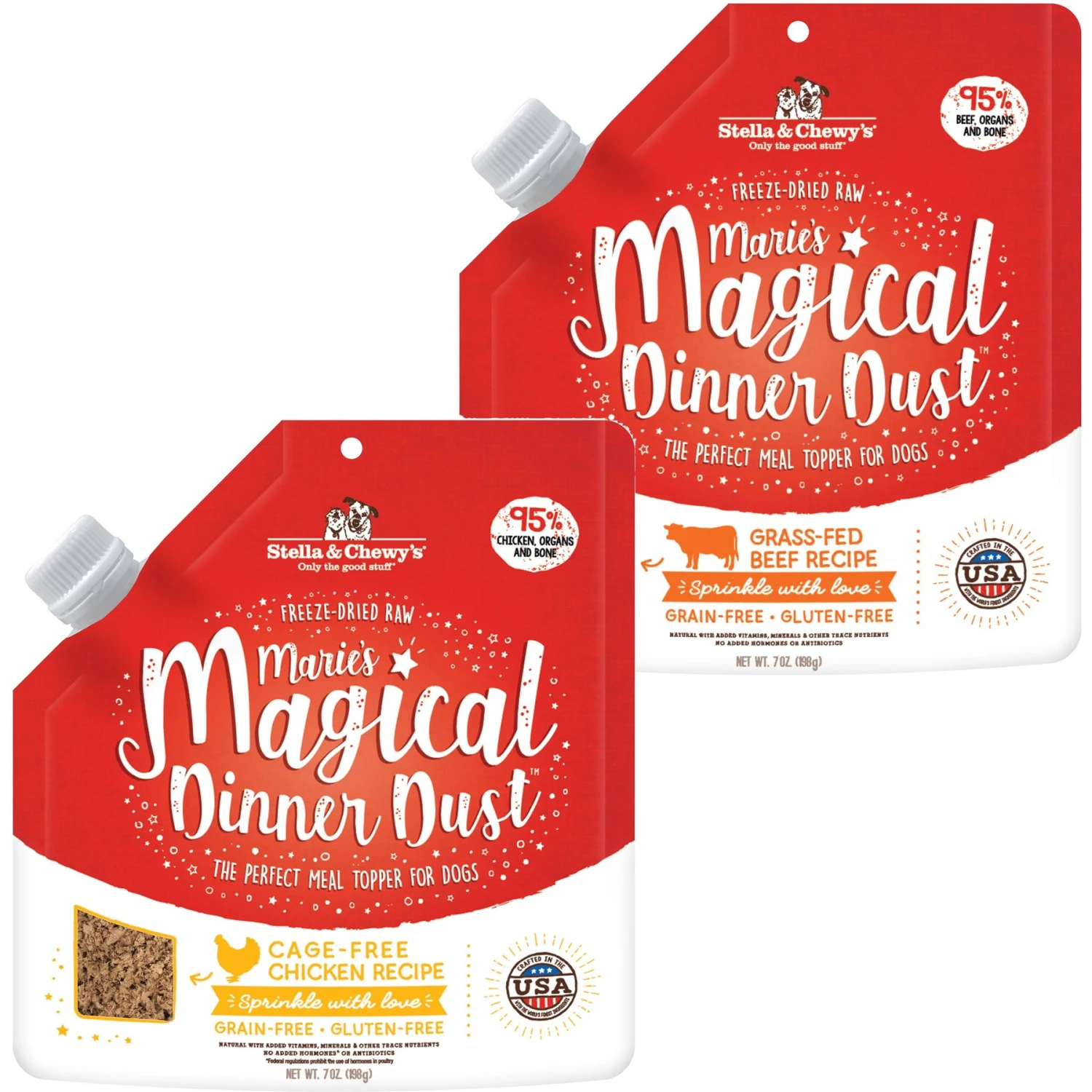 Stella & Chewy’s Marie’s Magical Dinner Dust Freeze-Dried Raw Cage-Free Chicken Dog Food Topper, 7-oz bag—Give your paw-tner a boost of raw nutrition with Stella & Chewy’s Marie’s Magical Dinner Dust Cage-Free Chicken Dog Food Topper. This grain-free, gluten-free, and freeze-dried recipe is crafted in the USA with 95% raw, cage-free chicken, organs, and bone plus organic fruits and vegetables like cranberries, spinach, broccoli, beets, carrots, blueberries, and more! Simply sprinkle the topper on your canine companion’s favorite nutritionally balanced and complete meal for an extra helping of vitamins, minerals, and other trace nutrients. Your furry friend will love the taste and you’ll love knowing that there are no added hormones, antibiotics, or binders in this delicious Dinner Dust!