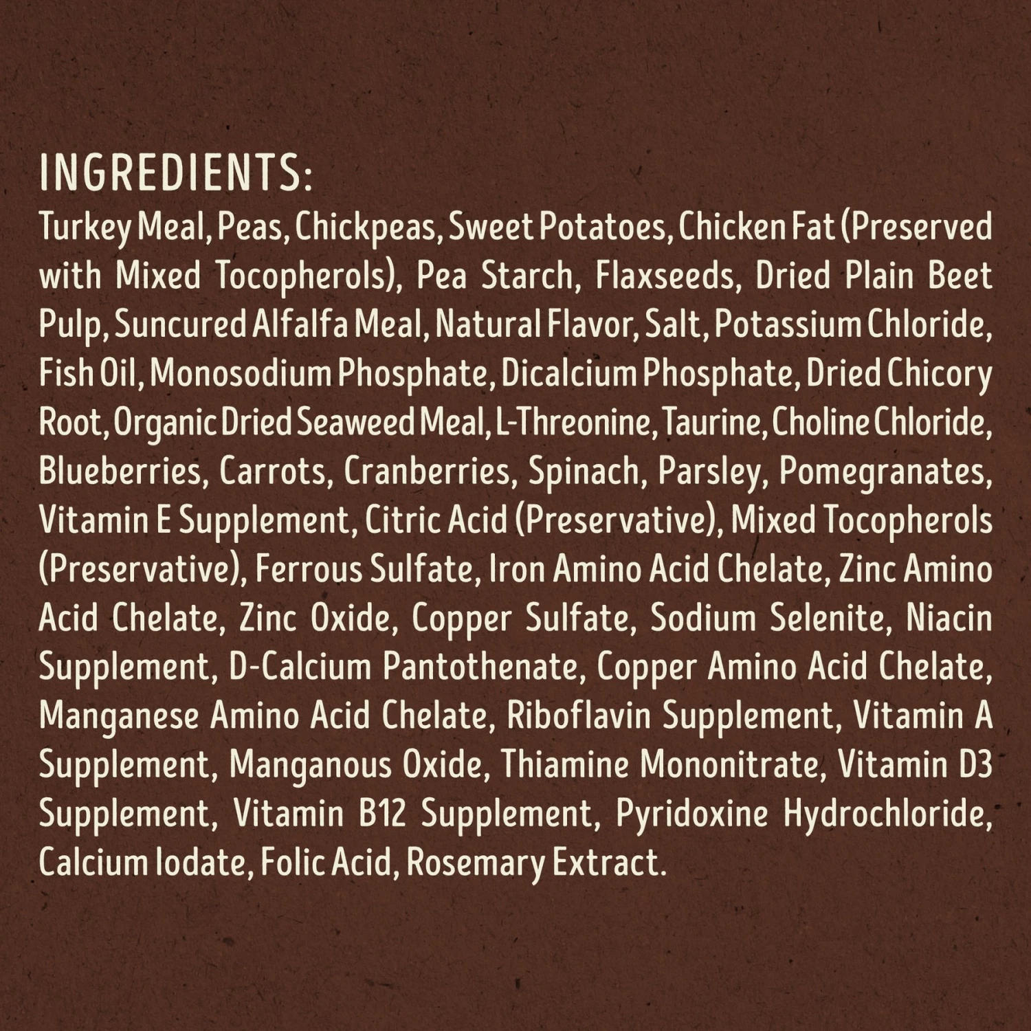 - Turkey meal, which contains even more protein than fresh turkey, is the very first ingredient.