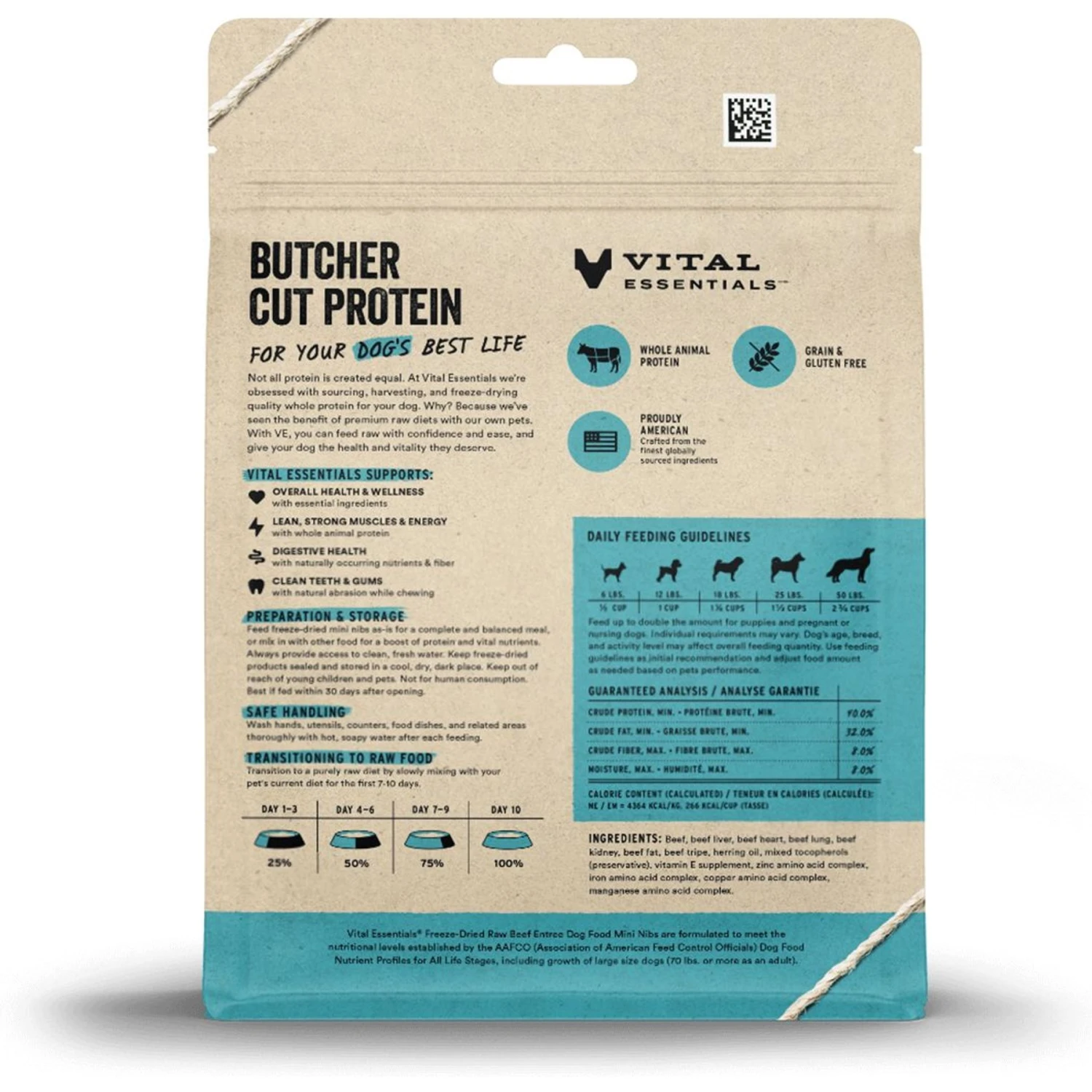Vital Essentials Freeze-Dried Raw Beef Entree Mini Nibs Dog Food, 5.5-oz bag—With Vital Essentials Beef Mini Nibs Grain-Free Freeze-Dried Dog Food, your dog will get the “Alpha” prey diet nature intended. An exclusive freeze-drying process helps retain all the active nutritional elements in this food while allowing it to be safely and conveniently stored without refrigeration. Locally sourced from America’s heartland, Mini Nibs contain a perfect blend of fresh, wholesome beef, bone and organ meats, and absolutely no grains, glutens or fillers. The beef entree can be served as a complete and balanced meal, a nutritious treat or mixed with kibble. Anyway you serve it, you can’t go wrong!