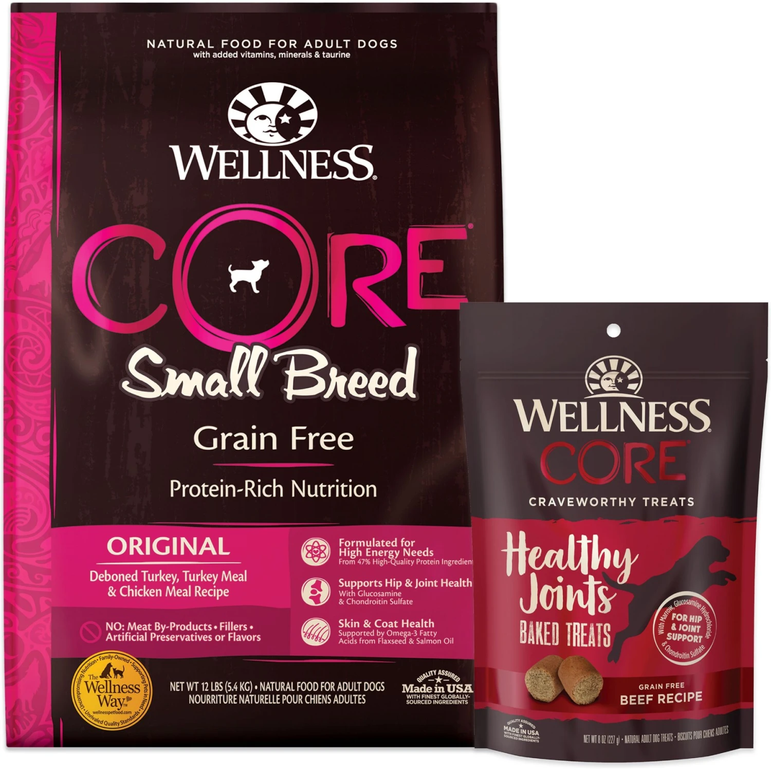 Wellness CORE Grain-Free Small Breed Turkey & Chicken Recipe Dry Dog Food & Wellness CORE Healthy Joints Beef Grain-Free Crunchy Dog Treats