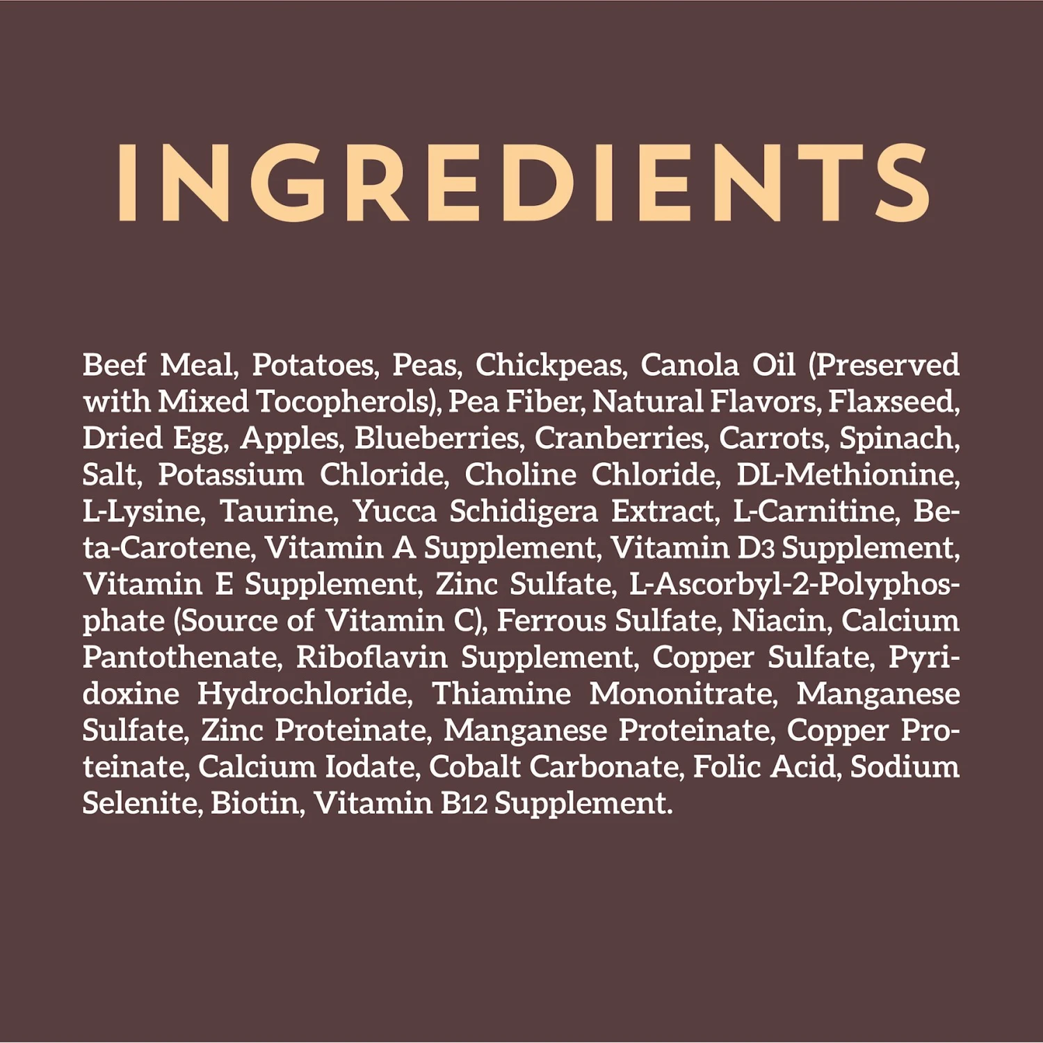 - Antioxidant formula is fortified with vitamin A and C plus nutrient-rich vegetables and fruits like peas, chickpeas, apples, blueberries, cranberries, carrots and spinach.